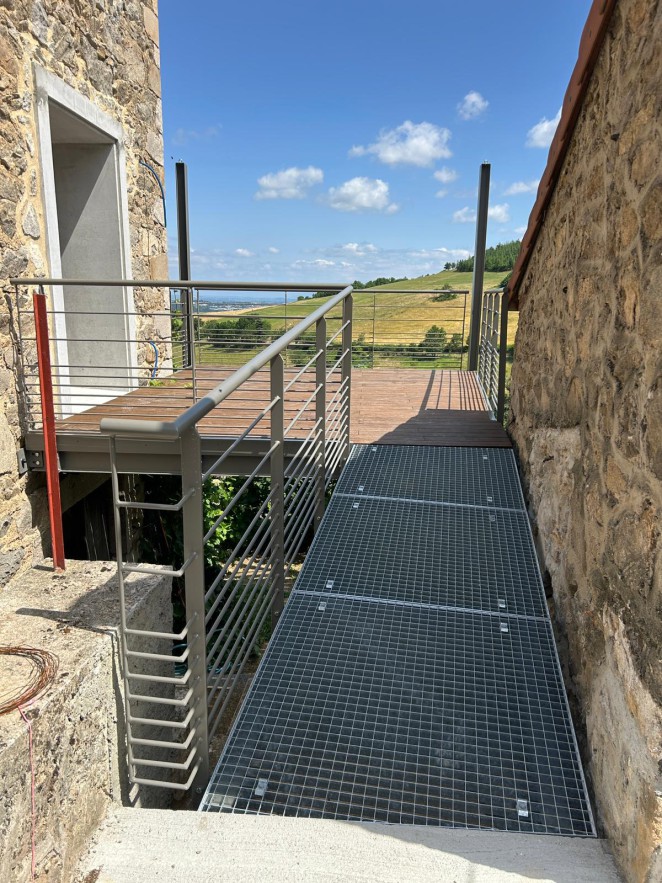 La passerelle métallique équipée d’un plancher en caillebotis offre un accès fiable et sécurisé à la terrasse. Cette solution assure une circulation confortable, même en conditions extérieures exposées.
