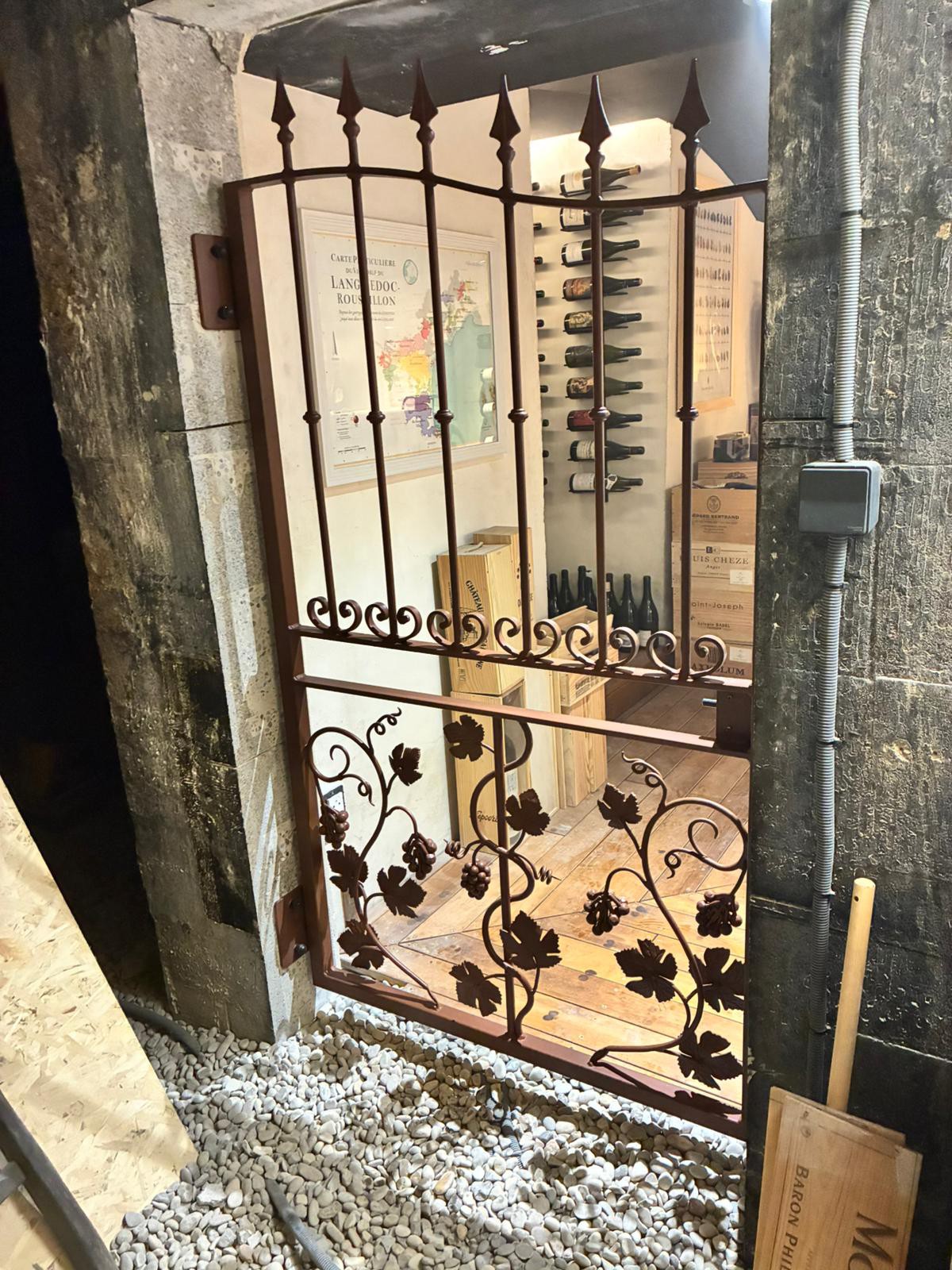 Metablok a accompagné son client dans la conception et l'installation d'un portillon métallique sur mesure pour sécuriser l'accès d'une cave. Le client souhaitait un portillon à la fois fonctionnel, sécurisé et esthétique qui se fonde dans la thématique du vin.